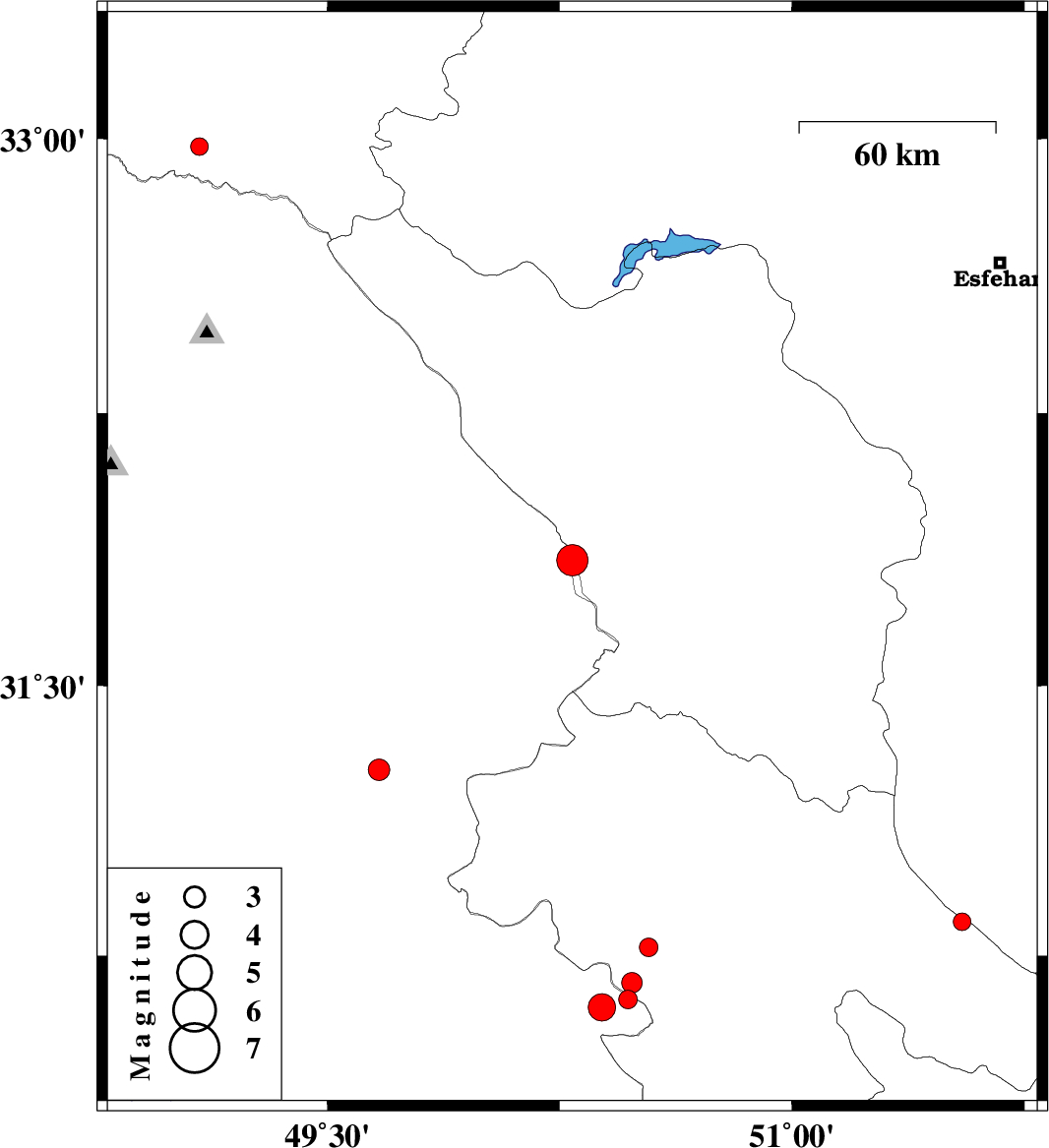 | 2015/10/20 | 15:10:05.3 | 18:40:05.3 | 30.628 | 50.471 | 14 | ML:2.7 | Khoozestan Province, 20 km South of Dehdasht | ||