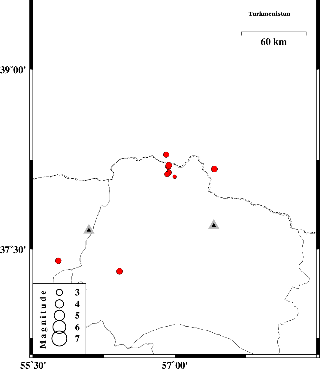 | 2015/10/30 | 05:08:06.8 | 08:38:06.8 | 38.172 | 57.417 | 14 | ML:3 | , 78 km North of Bojnurd | ||