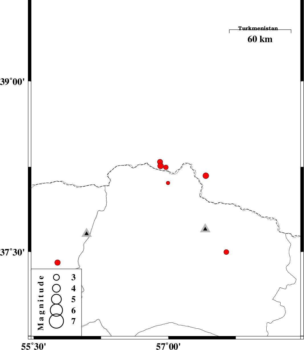 | 2015/10/30 | 05:08:06.8 | 08:38:06.8 | 38.172 | 57.417 | 14 | ML:3 | , 78 km North of Bojnurd | ||