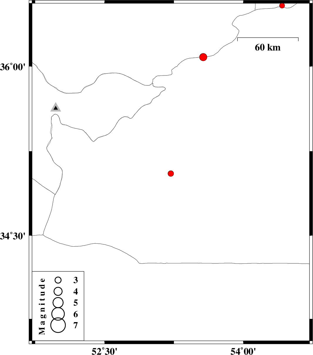 | 2015/11/05 | 23:21:30.3 | 02:51:30.3 | 35.052 | 53.216 | 18 | ML:2.8 | Semnan Province, 60 km South-West of Semnan | ||