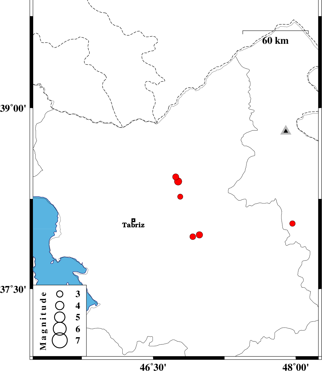 2015/10/12 | 13:34:31.3 | 17:04:31.3 | 37.936 | 46.916 | 14 | ML:2.8 | Azarbaijan Sharghi Province, 13 km North of Bostanabad |