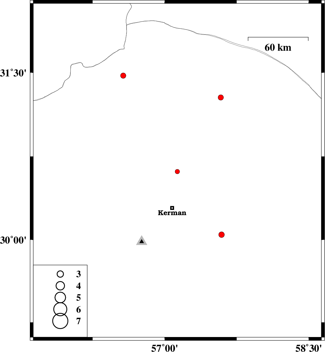 | 2015/11/07 | 17:12:22.5 | 20:42:22.5 | 30.046 | 57.592 | 6 | ML:2.7 | Kerman Province, 56 km South-East of Kerman | ||