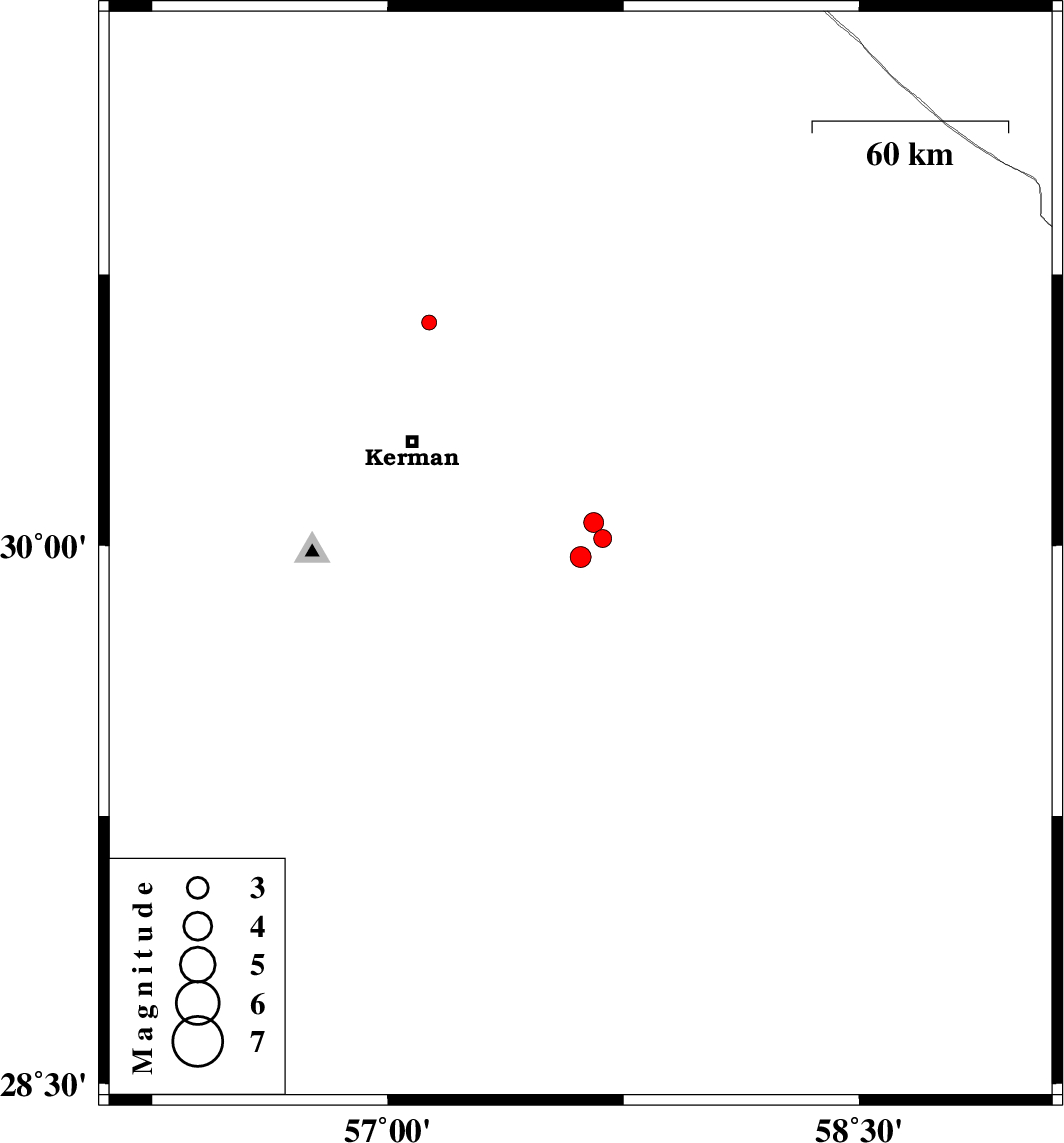 | 2015/11/12 | 08:24:42.0 | 11:54:42.0 | 30.615 | 57.132 | 18 | ML:2.1 | Kerman Province, 37 km North of Kerman |