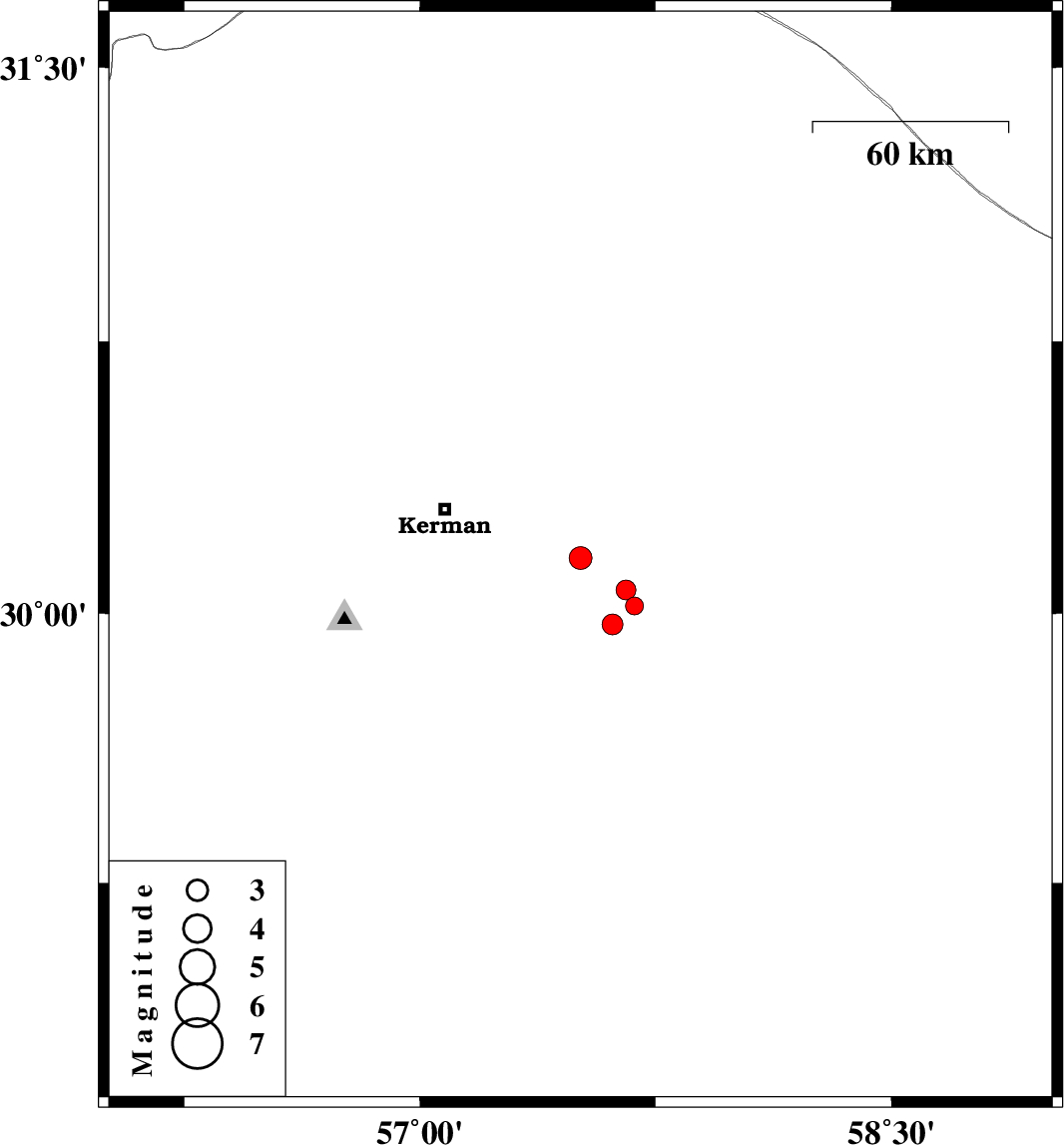 | 2015/11/19 | 15:01:08.7 | 18:31:08.7 | 29.969 | 57.613 | 14 | ML:3 | Kerman Province, 62 km South-East of Kerman | ||