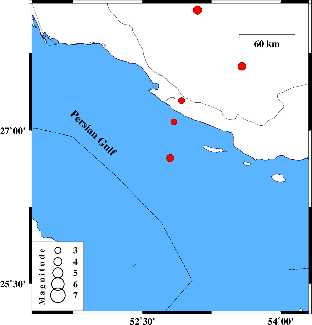 | 2015/11/11 | 11:20:00.4 | 14:50:00.4 | 27.083 | 52.842 | 15 | ML:3.1 | Persian Gulf, 52 km South of Mehr | ||