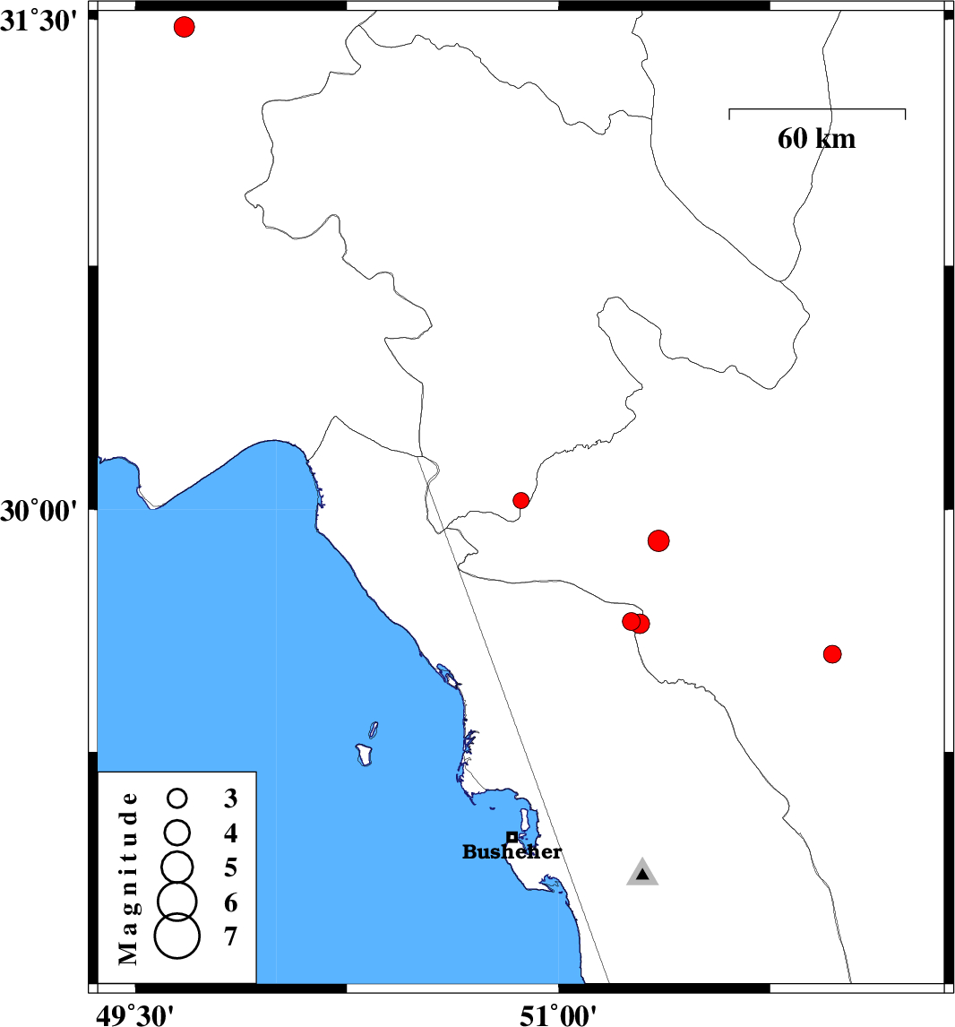 | 2015/11/30 | 12:49:52.1 | 16:19:52.1 | 29.647 | 51.288 | 14 | ML:3.1 | Bushehr Province, 35 km -West of Kazerun |