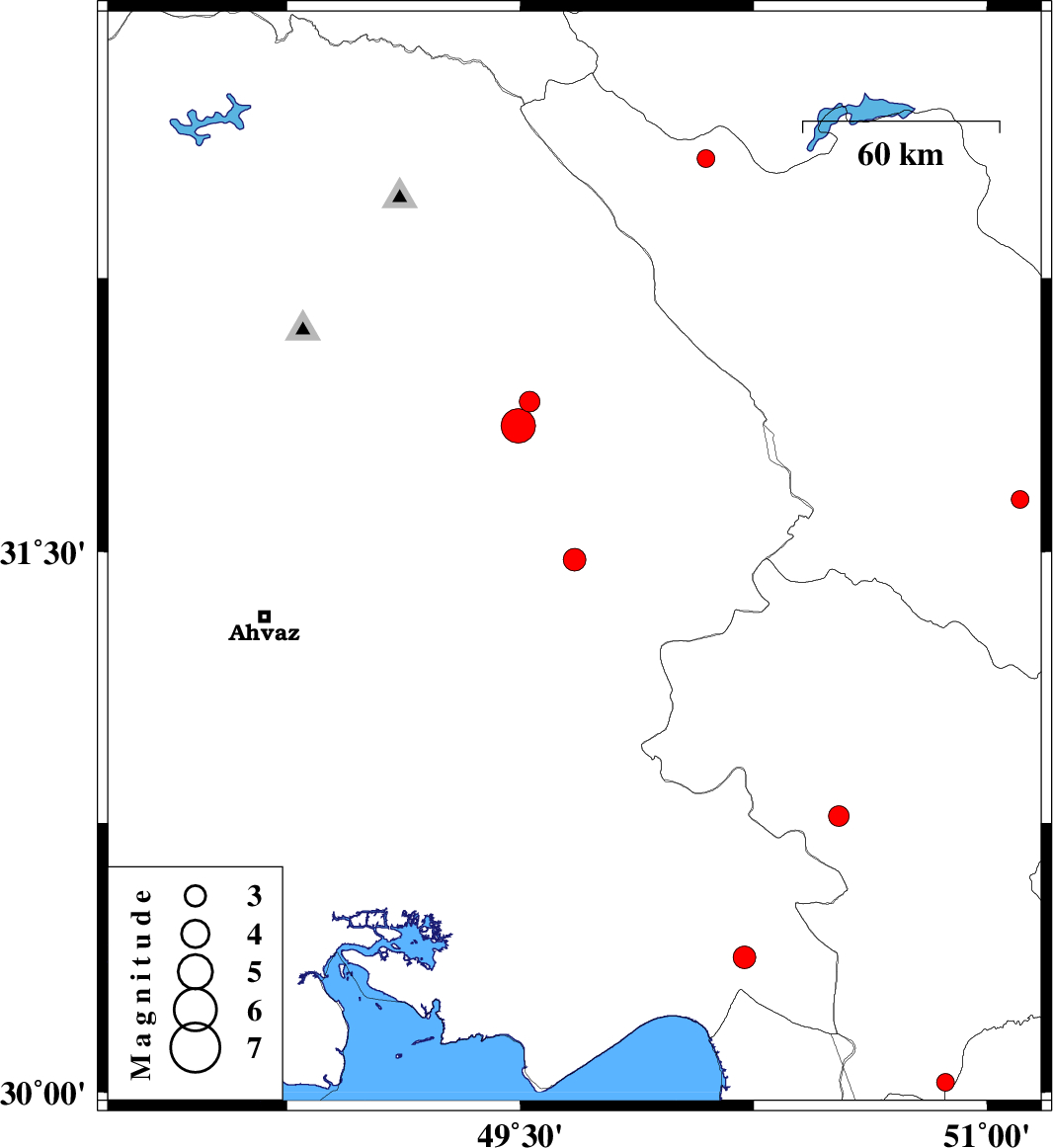 | 2015/11/03 | 03:53:36.1 | 07:23:36.1 | 30.376 | 50.22 | 15 | ML:3.3 | Khoozestan Province, 25 km South of Behbahan |