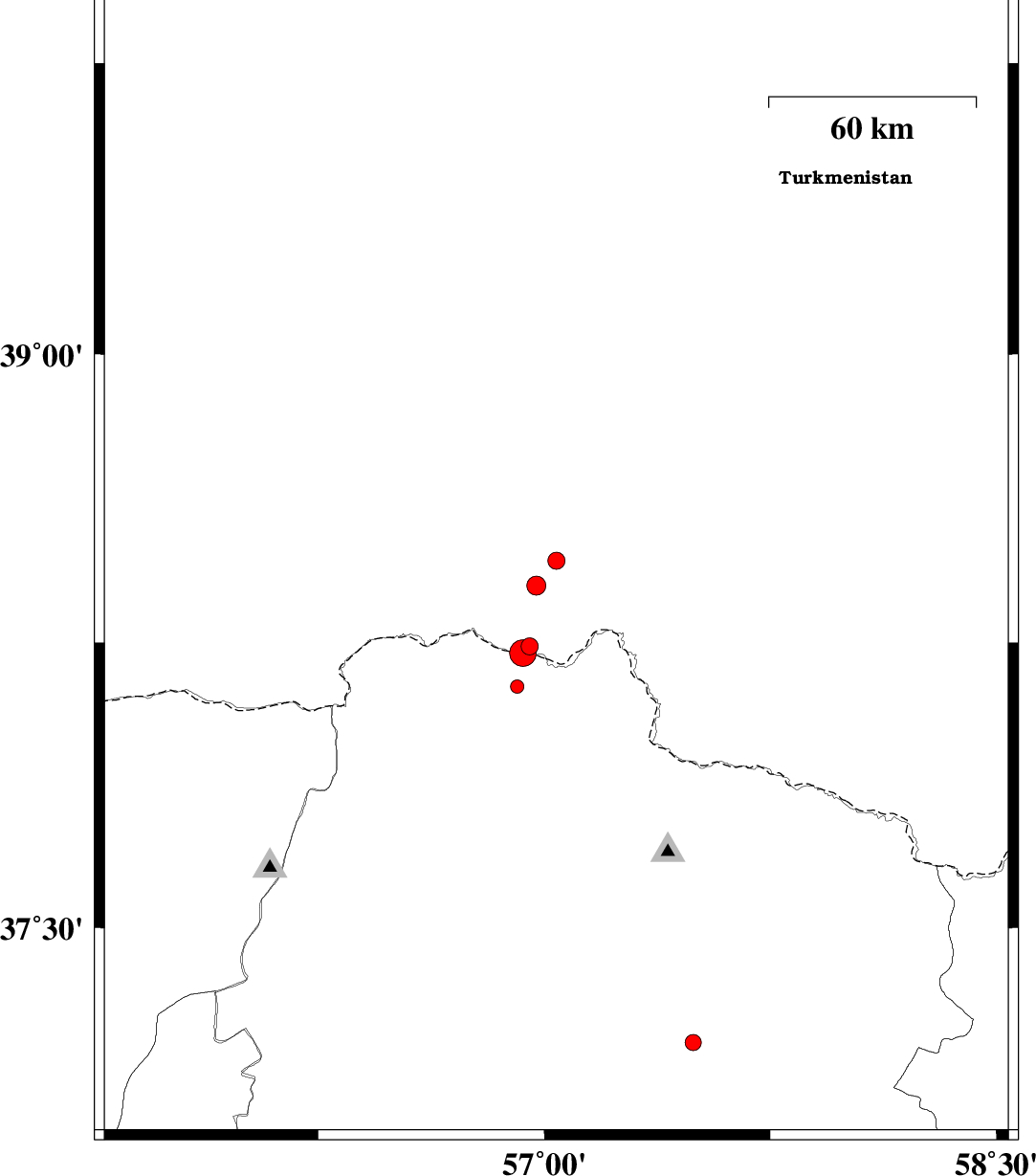 | 2015/11/21 | 03:29:24.6 | 06:59:24.6 | 38.398 | 56.974 | 14 | ML:2.8 | Turkmenistan, 94 km North of Ashkhaneh | ||