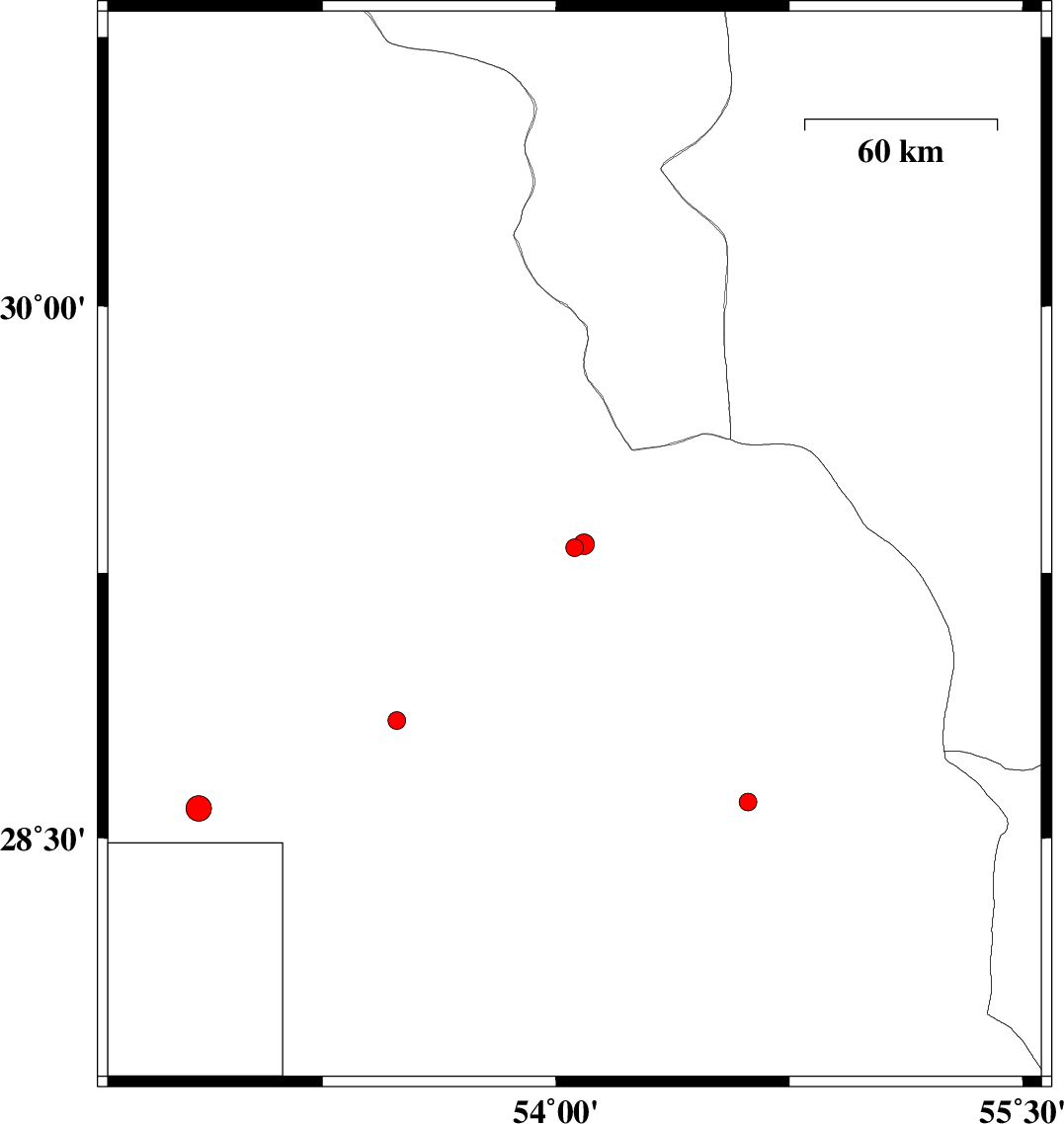 | 2015/11/30 | 07:09:25.7 | 10:39:25.7 | 28.834 | 53.488 | 18 | ML:2.6 | Fars Province, 20 km South-West of Fasa | ||