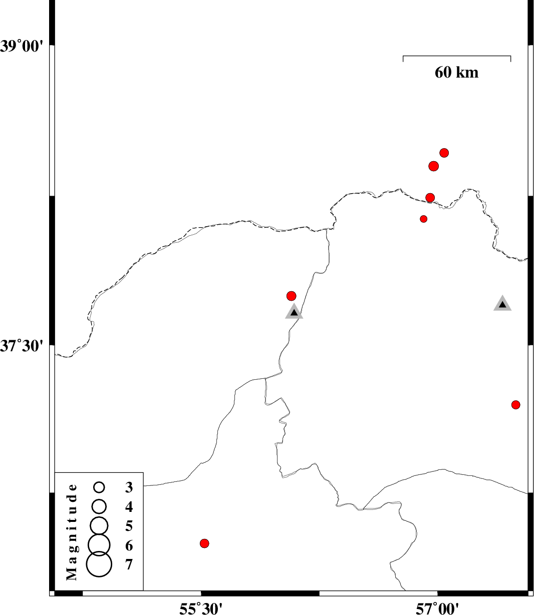 | 2015/12/20 | 03:41:20.3 | 07:11:20.3 | 37.747 | 56.072 | 14 | ML:2.7 | Golestan Province, 65 km North-East of Kalaleh | ||