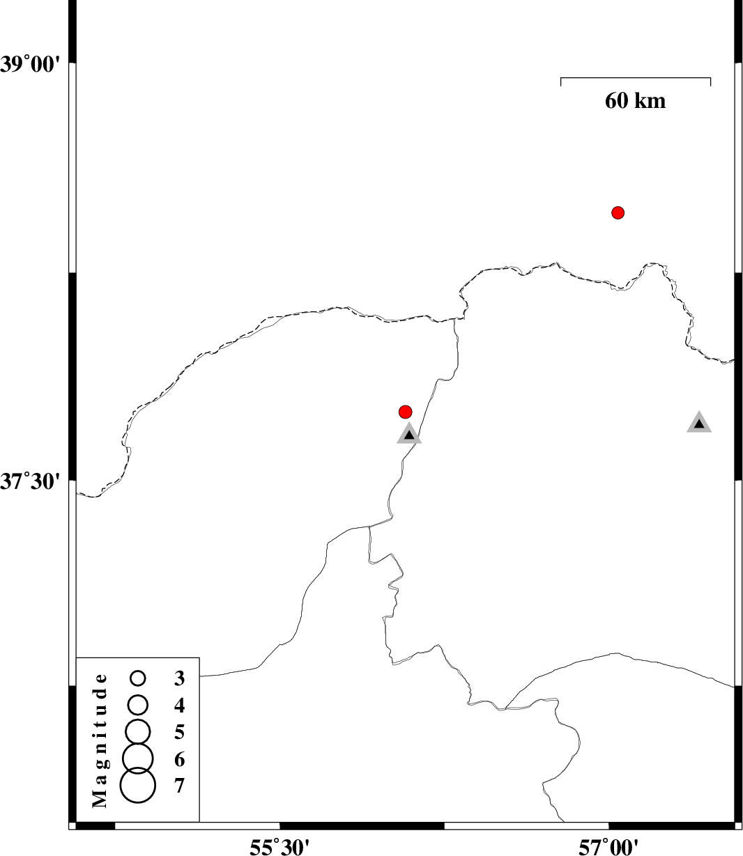 | 2015/12/20 | 03:41:20.3 | 07:11:20.3 | 37.747 | 56.072 | 14 | ML:2.7 | Golestan Province, 65 km North-East of Kalaleh | ||