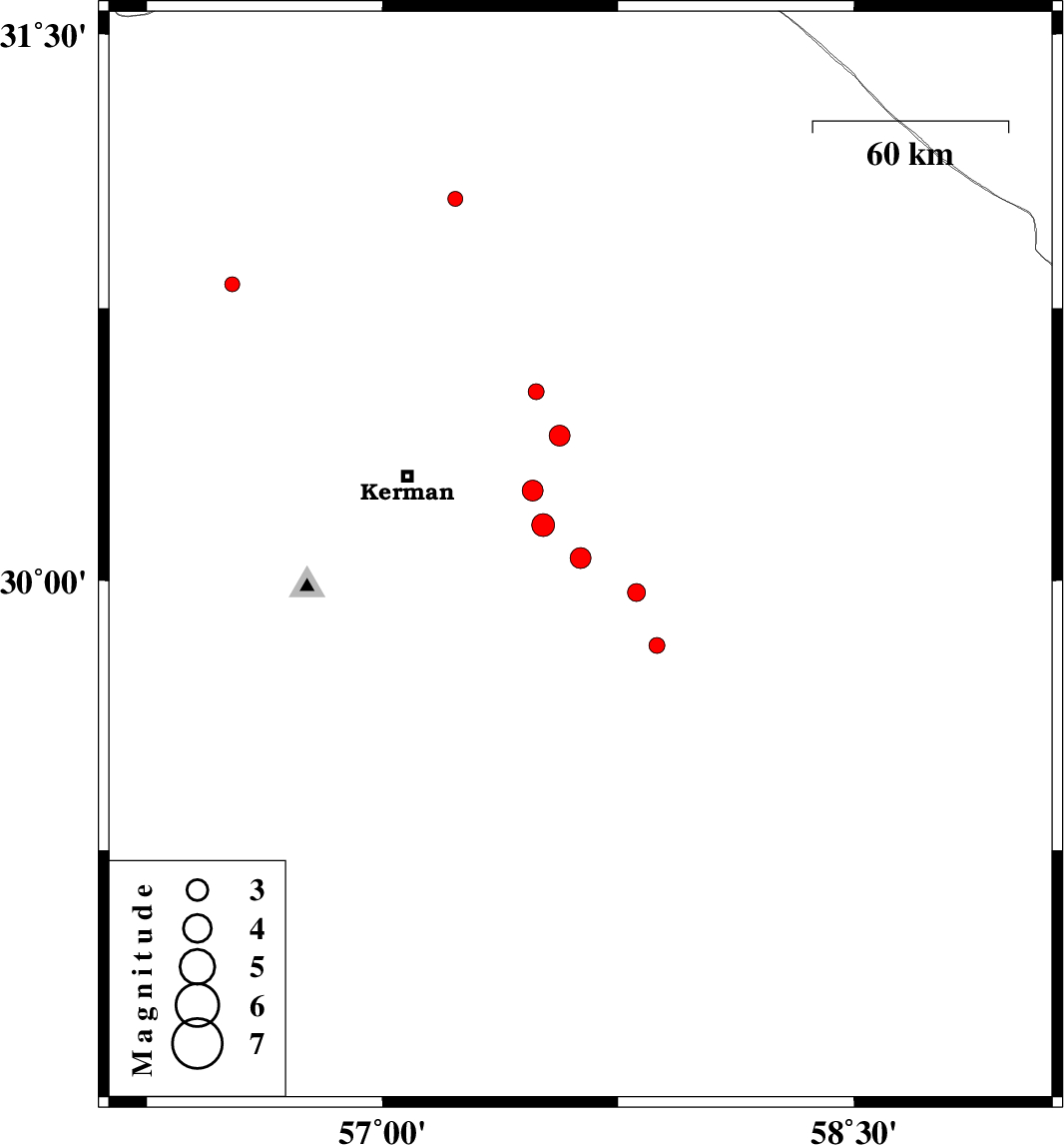 | 2015/12/20 | 04:28:21.8 | 07:58:21.8 | 30.4 | 57.564 | 14 | ML:2.9 | Kerman Province, 48 km North-East of Kerman | ||