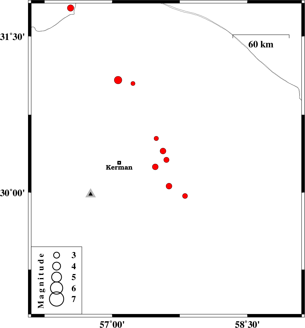 | 2015/12/20 | 04:28:21.8 | 07:58:21.8 | 30.4 | 57.564 | 14 | ML:2.9 | Kerman Province, 48 km North-East of Kerman | ||