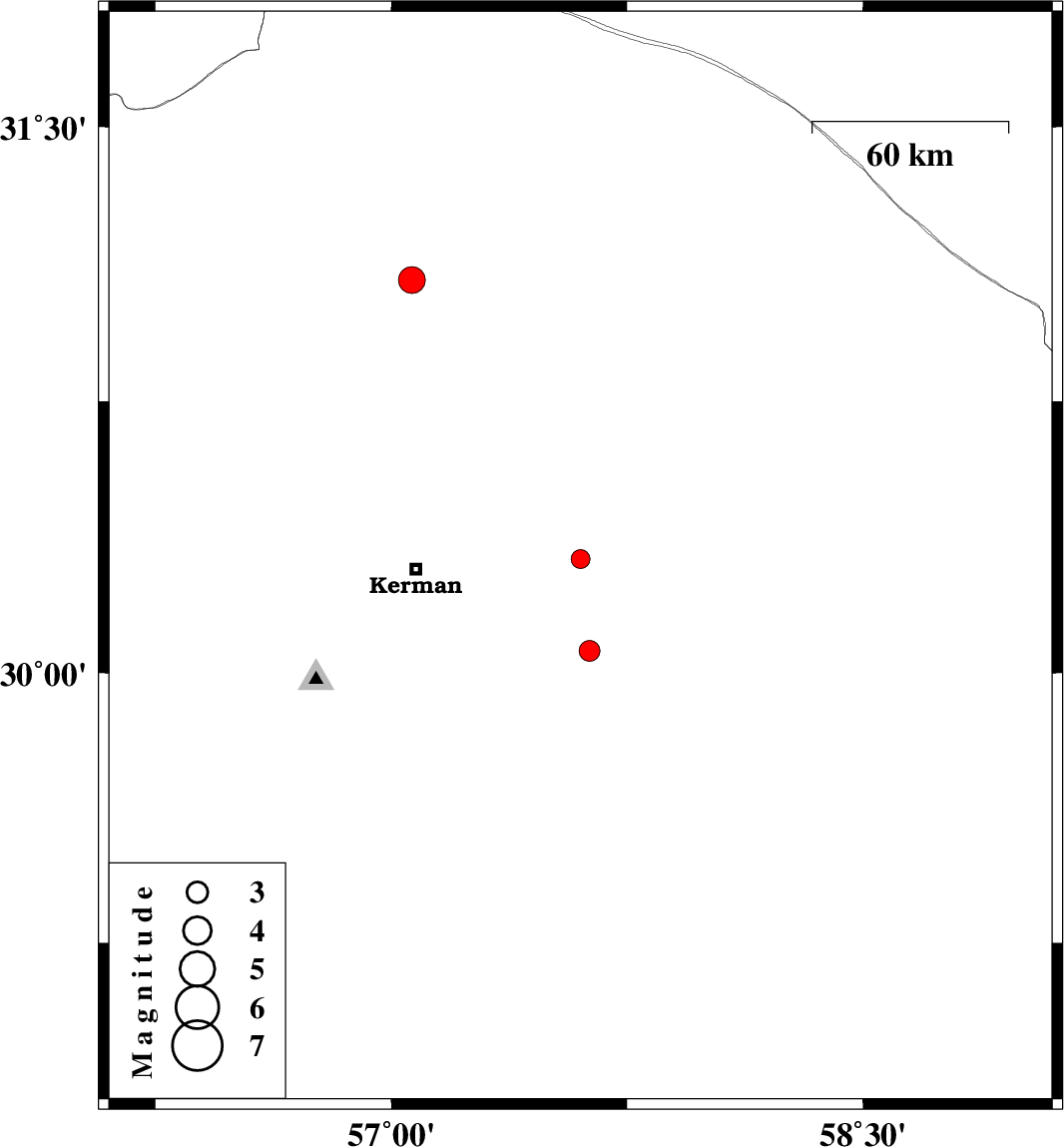 | 2015/12/28 | 13:22:36.8 | 16:52:36.8 | 30.315 | 57.602 | 14 | ML:2.7 | Kerman Province, 50 km -East of Kerman | ||