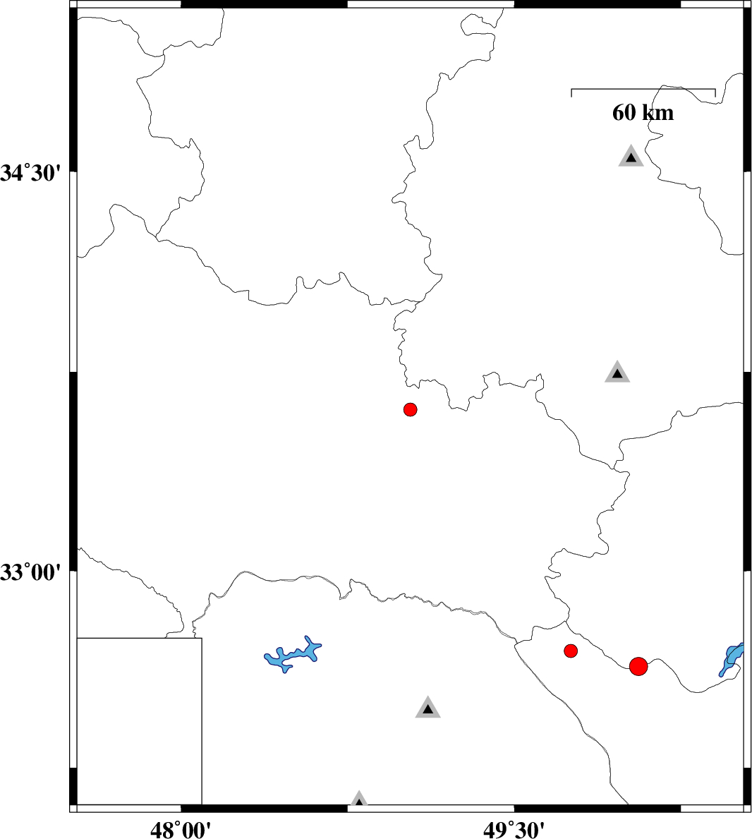 | 2015/12/29 | 09:03:16.6 | 12:33:16.6 | 33.608 | 49.032 | 14 | ML:2.7 | Lorestan Province, 14 km North of Dorud | ||