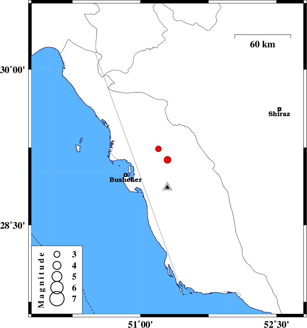 | 2016/01/06 | 06:10:57.5 | 09:40:57.5 | 29.132 | 51.298 | 14 | ML:3.5 | Bushehr Province, 17 km South of Borazjan | ||