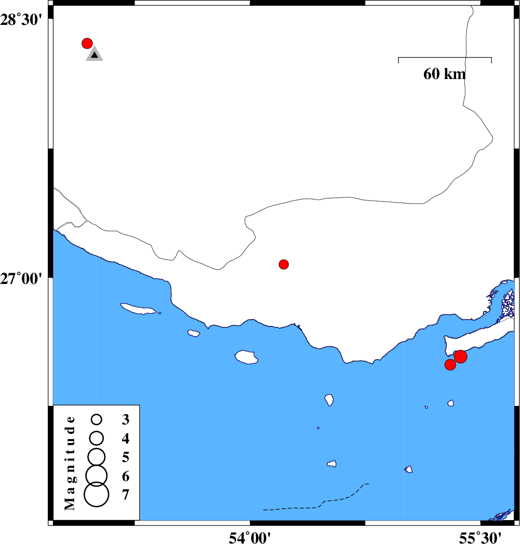 | 2016/01/04 | 03:05:46.2 | 06:35:46.2 | 26.538 | 55.37 | 15 | ML:3.8 | Persian Gulf, 52 km -East of Bandar-e lengeh | ||