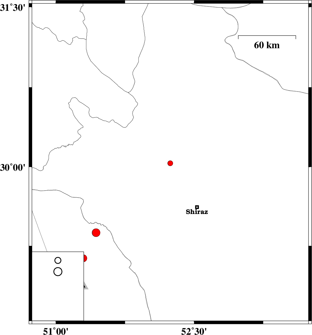 | 2016/01/07 | 19:37:21.7 | 23:07:21.7 | 29.376 | 51.436 | 14 | ML:3.9 | Bushehr Province, 26 km North-East of Borazjan | ||