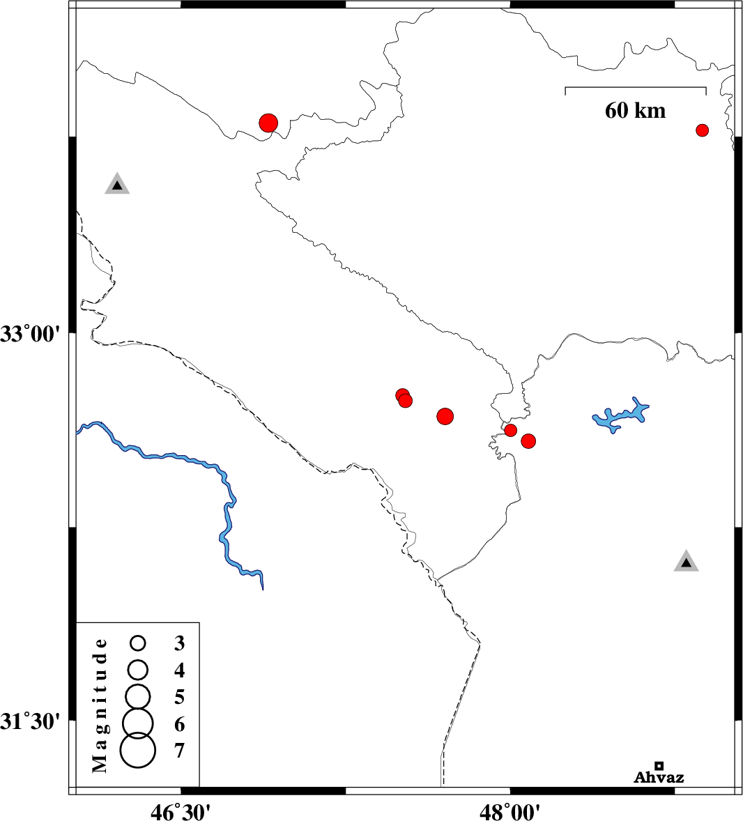 | 2016/01/06 | 13:14:03.3 | 16:44:03.3 | 32.582 | 48.083 | 14 | ML:2.9 | Khoozestan Province, 29 km North-West of Andimeshk | ||