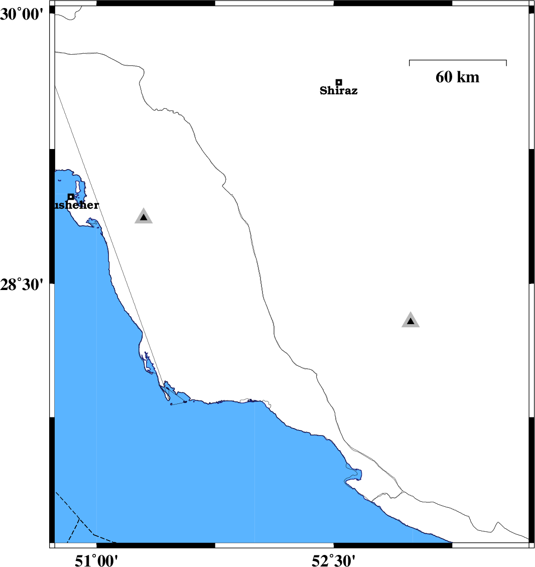 | 2016/01/30 | 11:59:34.4 | 15:29:34.4 | 29.262 | 51.251 | 6 | ML:3 | Bushehr Province, 4 km of Borazjan | ||