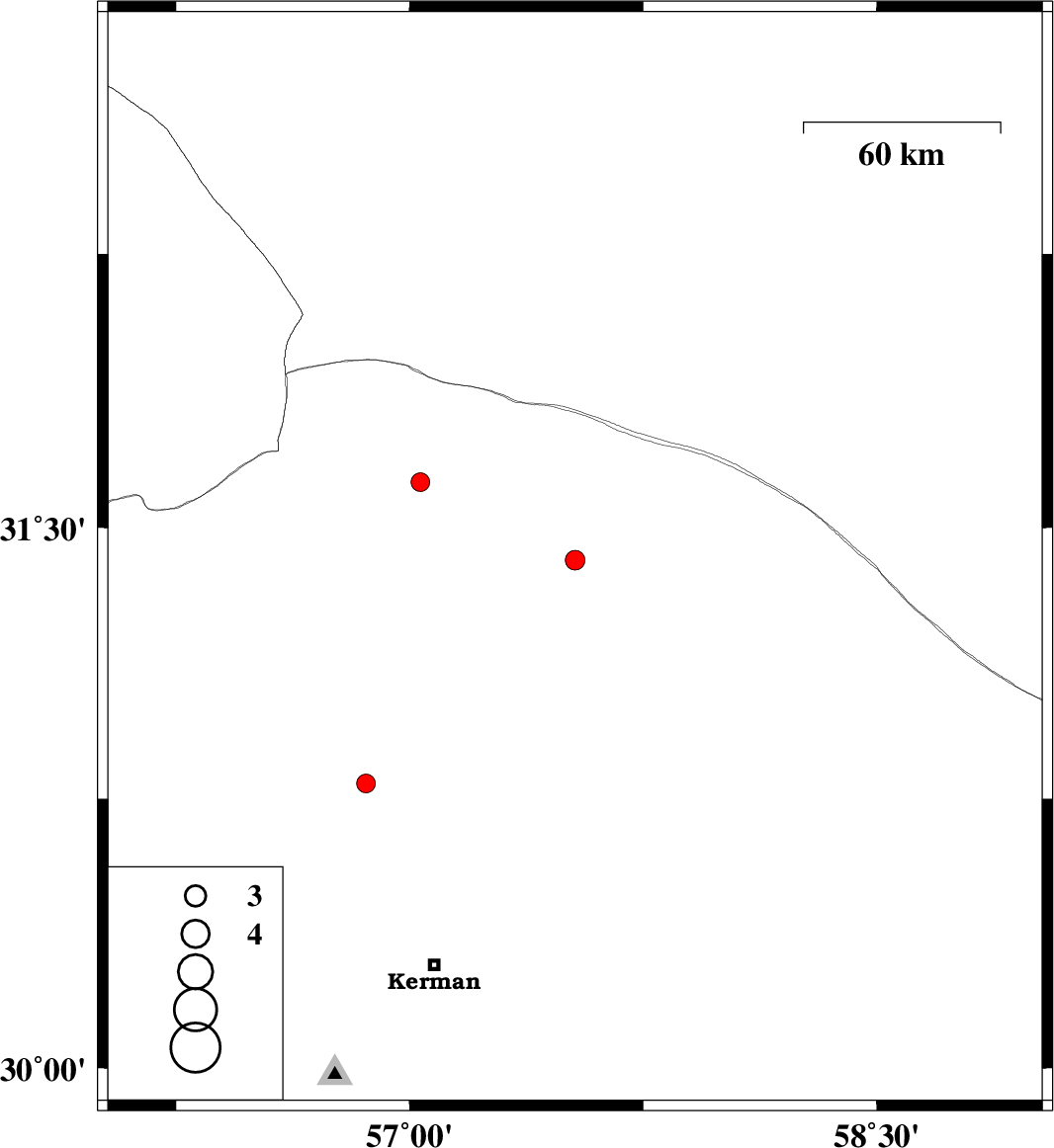 | 2016/01/28 | 04:05:14.0 | 07:35:14.0 | 31.625 | 57.034 | 18 | ML:2.7 | Kerman Province, 45 km North-East of Ravar | ||