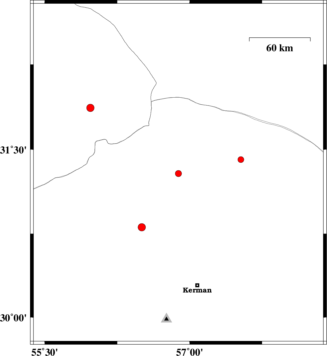 | 2016/02/10 | 00:10:31.7 | 03:40:31.7 | 31.41 | 57.531 | 16 | ML:2.8 | Kerman Province, 70 km North-East of Ravar | ||