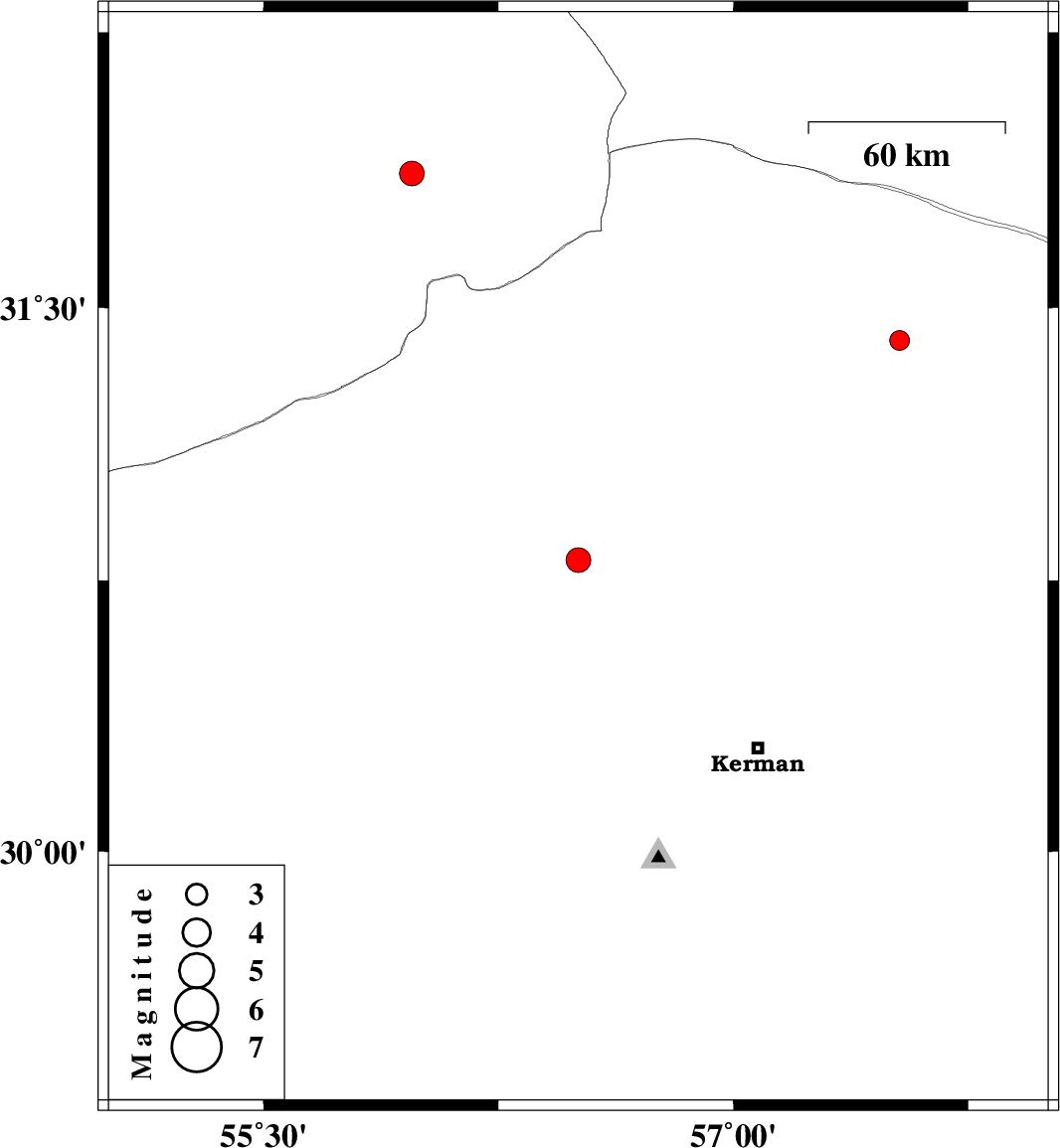 | 2016/02/08 | 09:58:00.1 | 13:28:00.1 | 31.867 | 55.973 | 14 | ML:3.5 | Yazd Province, 62 km North-East of Bafq |