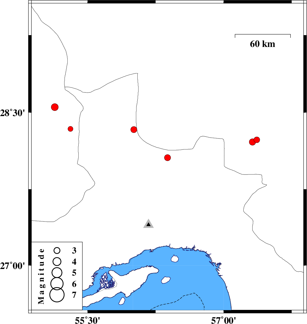 | 2016/02/13 | 15:27:43.6 | 18:57:43.6 | 28.233 | 57.366 | 14 | ML:2.9 | Kerman Province, 45 km North-West of Kahnuj | ||