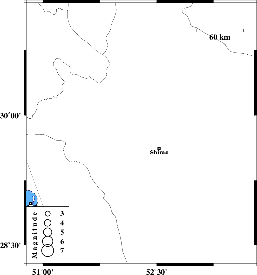 | 2016/02/22 | 05:30:40.8 | 09:00:40.8 | 29.786 | 52.284 | 14 | ML:3.3 | Fars Province, 30 km North-West of Shiraz |