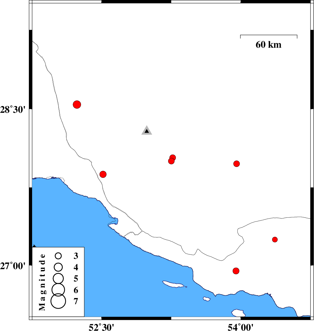 | 2016/02/12 | 22:05:46.9 | 01:35:46.9 | 27.876 | 52.516 | 14 | ML:3.2 | Fars Province, 20 km -East of Jam | ||
