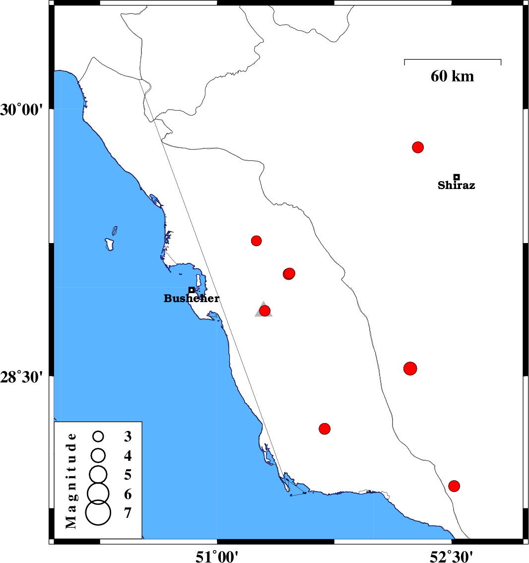 | 2016/01/30 | 11:59:34.4 | 15:29:34.4 | 29.262 | 51.251 | 6 | ML:3 | Bushehr Province, 4 km of Borazjan |