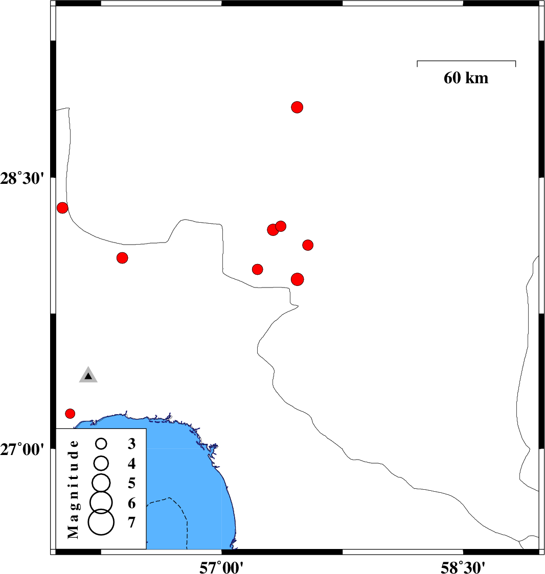 | 2016/02/20 | 01:42:12.7 | 05:12:12.7 | 28.128 | 57.535 | 14 | ML:2.9 | Kerman Province, 25 km North-West of Kahnuj | ||