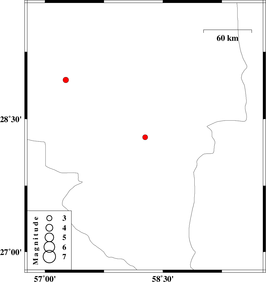 | 2016/03/26 | 04:42:59.3 | 09:12:59.3 | 28.937 | 57.265 | 46 | ML:3.3 | Kerman Province, 55 km North-West of Jiroft |
