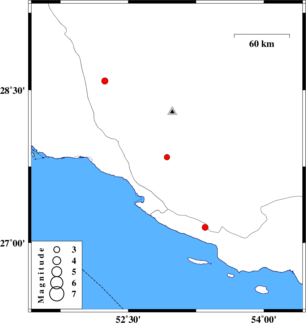 | 2016/04/08 | 07:57:21.3 | 12:27:21.3 | 27.842 | 52.928 | 17 | ML:2.8 | Fars Province, 33 km North of Mehr | ||