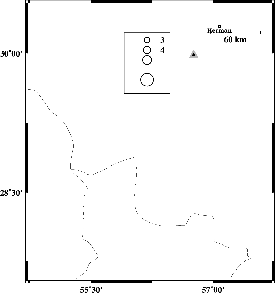 2016/04/05 | 04:08:00.2 | 08:38:00.2 | 30.459 | 57.563 | 14 | ML:3.9 | Kerman Province, 50 km North-East of Kerman | ||