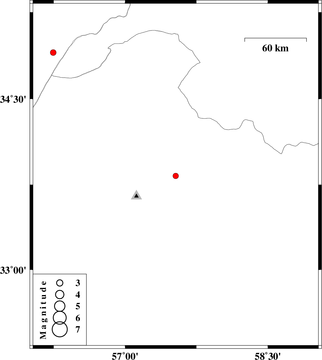2016/04/26 | 14:27:47.6 | 18:57:47.6 | 33.827 | 57.532 | 16 | ML:2.7 | Khorasan(center) Province, 62 km North-East of Tabas | ||