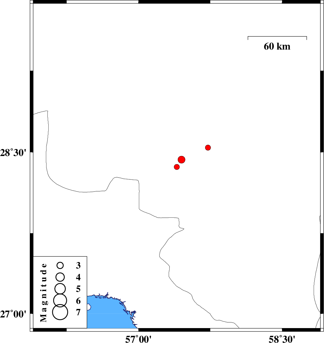 | 2016/04/28 | 09:15:39.9 | 13:45:39.9 | 28.543 | 57.725 | 14 | ML:2.5 | Kerman Province, 14 km South of Jiroft | ||