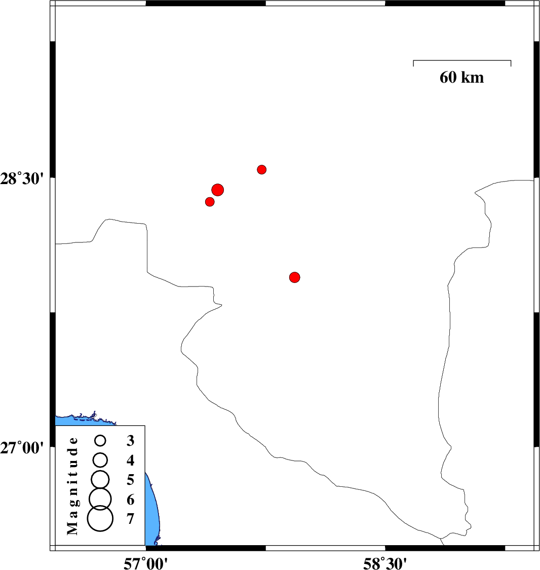 | 2016/04/28 | 09:15:39.9 | 13:45:39.9 | 28.543 | 57.725 | 14 | ML:2.5 | Kerman Province, 14 km South of Jiroft | ||