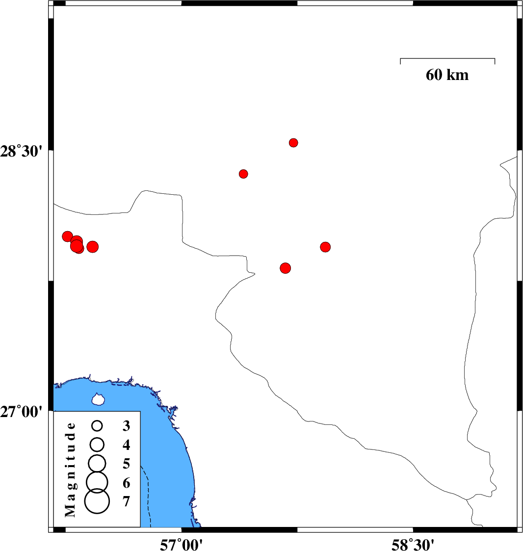 | 2016/05/05 | 20:47:54.2 | 01:17:54.2 | 27.823 | 57.672 | 14 | ML:3.1 | Kerman Province, 14 km South of Kahnuj | ||