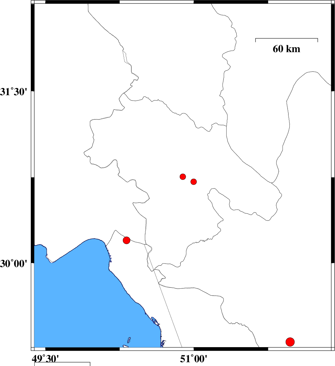 | 2016/05/11 | 05:24:36.3 | 09:54:36.3 | 30.198 | 50.32 | 15 | ML:3.2 | Khoozestan Province, 45 km South of Behbahan | ||