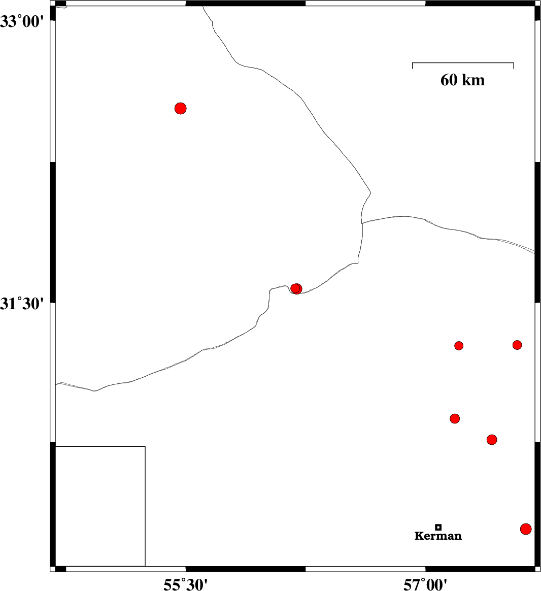 | 2016/05/13 | 10:54:55.6 | 15:24:55.6 | 30.763 | 57.415 | 14 | ML:2.8 | Kerman Province, 62 km North-East of Kerman | ||