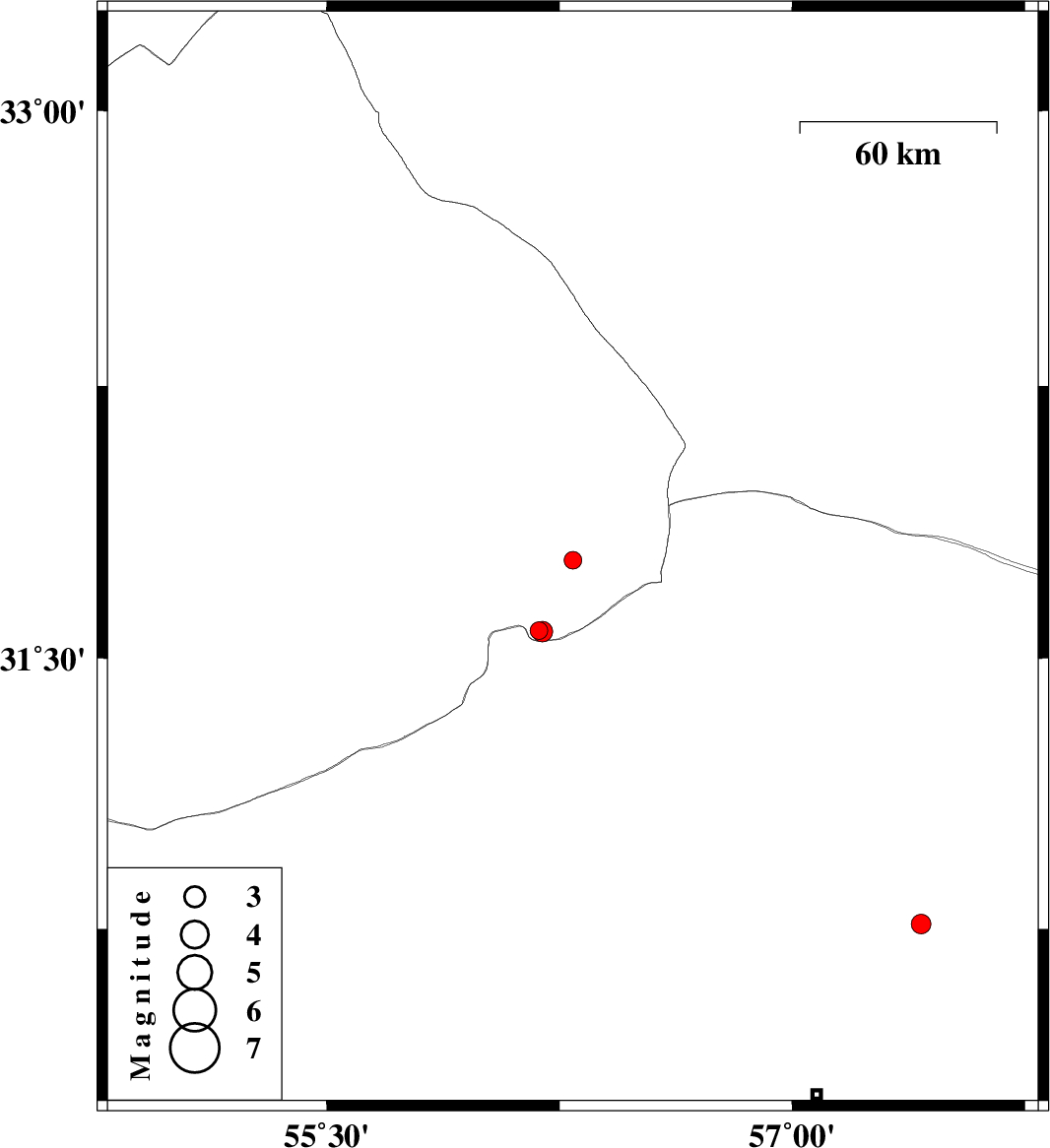 | 2016/05/14 | 04:10:35.8 | 08:40:35.8 | 31.574 | 56.194 | 14 | ML:2.9 | Yazd Province, 75 km -East of Bafq | ||