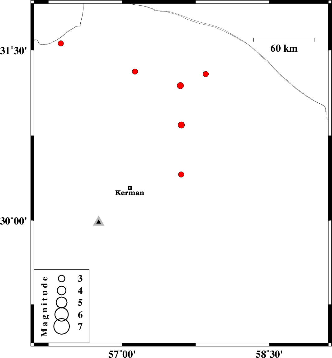 | 2016/05/30 | 06:00:53.6 | 10:30:53.6 | 30.406 | 57.602 | 14 | ML:2.6 | Kerman Province, 52 km North-East of Kerman | ||