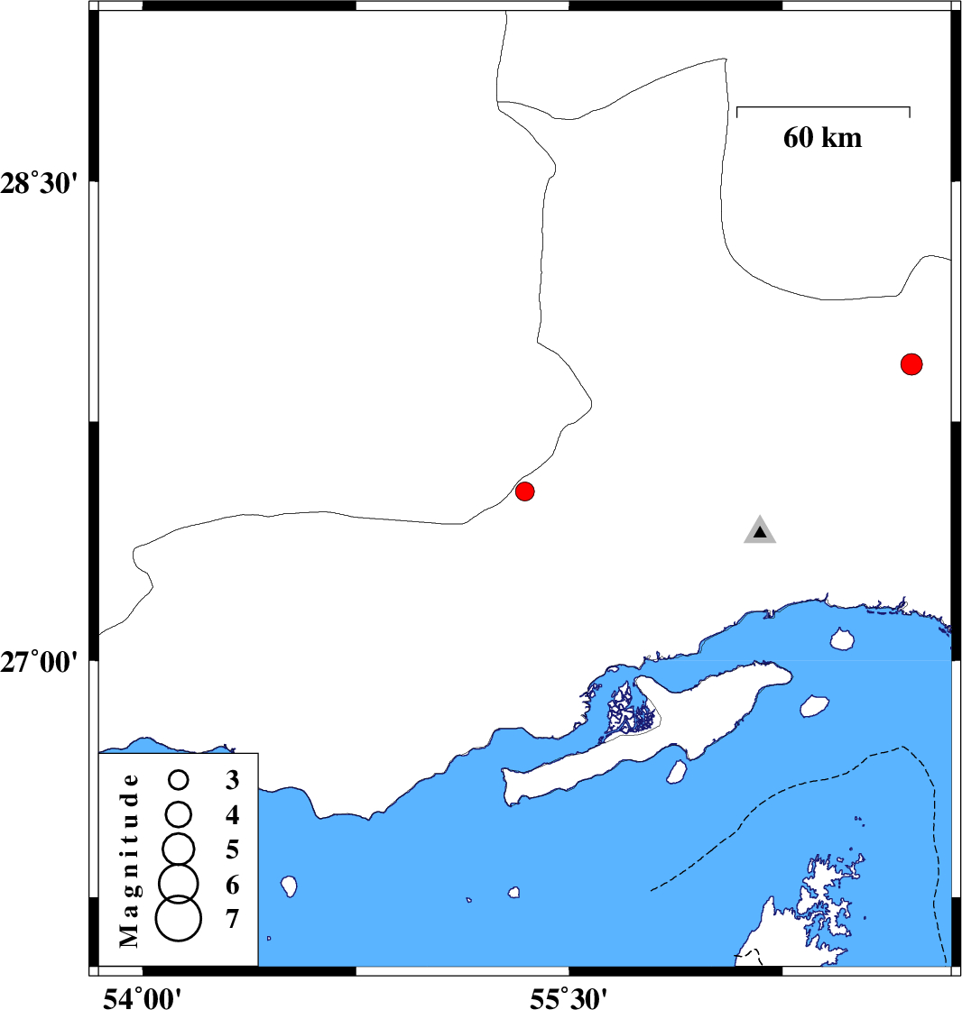 | 2016/06/07 | 15:25:33.9 | 19:55:33.9 | 27.531 | 55.344 | 15 | ML:2.9 | Hormozgan Province, 100 km South-East of Lar |