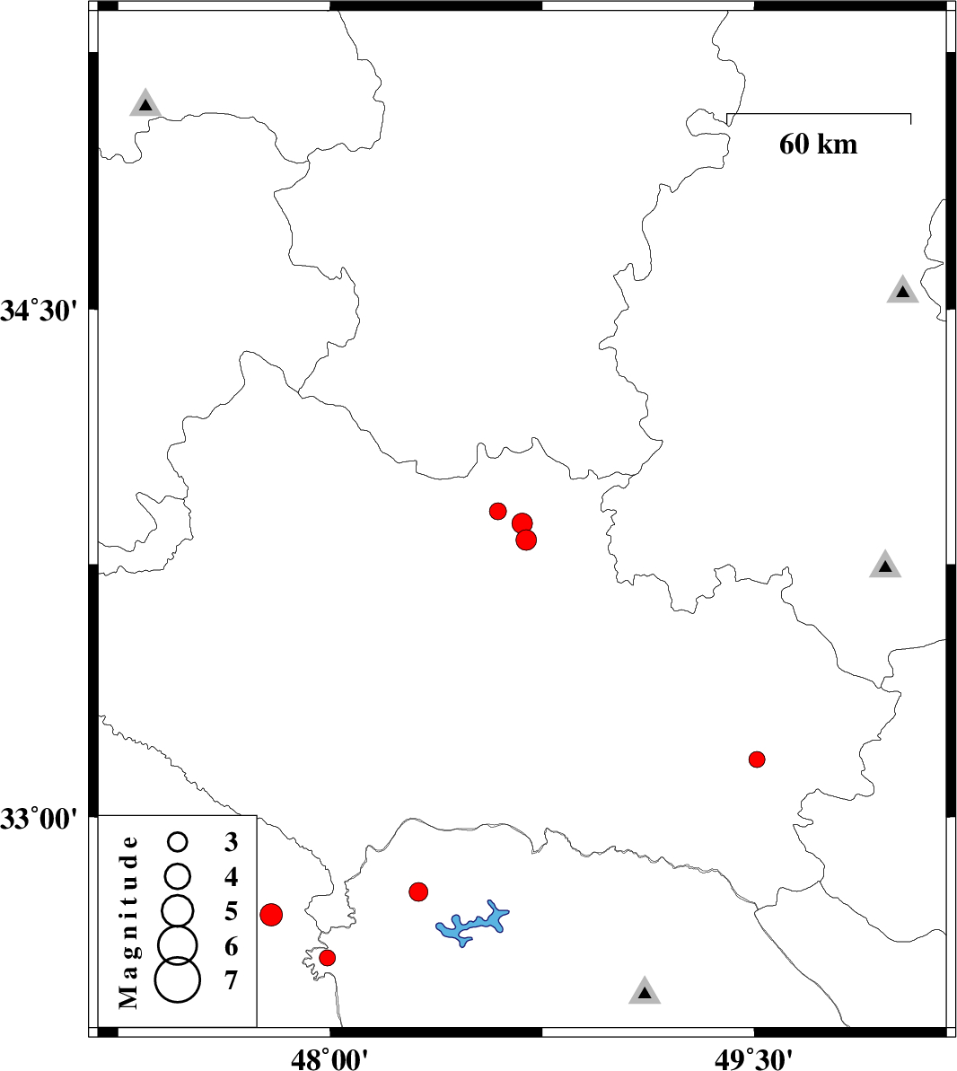 | 2016/06/09 | 06:04:13.5 | 10:34:13.5 | 33.822 | 48.693 | 15 | ML:3.2 | Lorestan Province, 10 km of Borujerd | ||