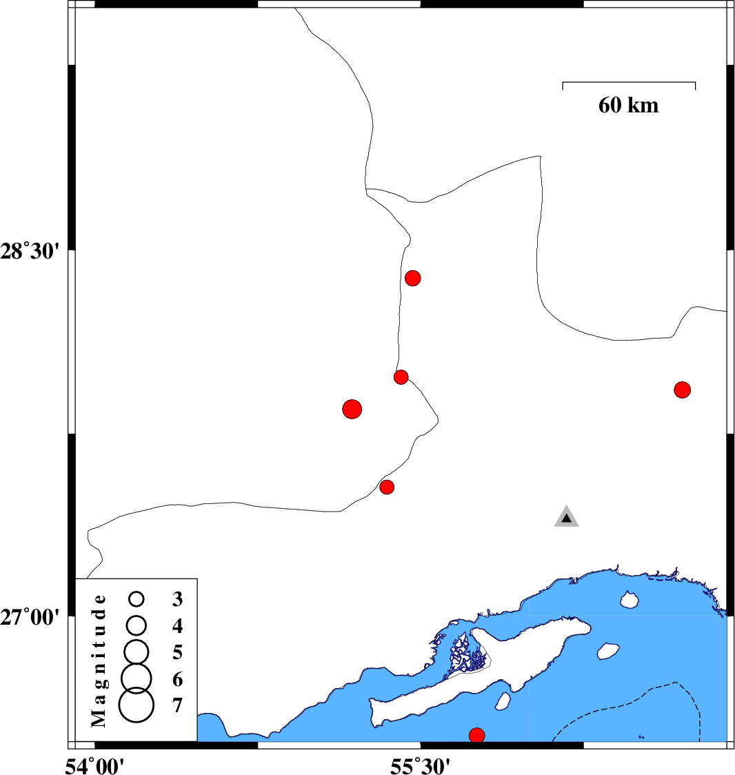 | 2016/06/07 | 15:25:33.9 | 19:55:33.9 | 27.531 | 55.344 | 15 | ML:2.9 | Hormozgan Province, 100 km South-East of Lar | ||