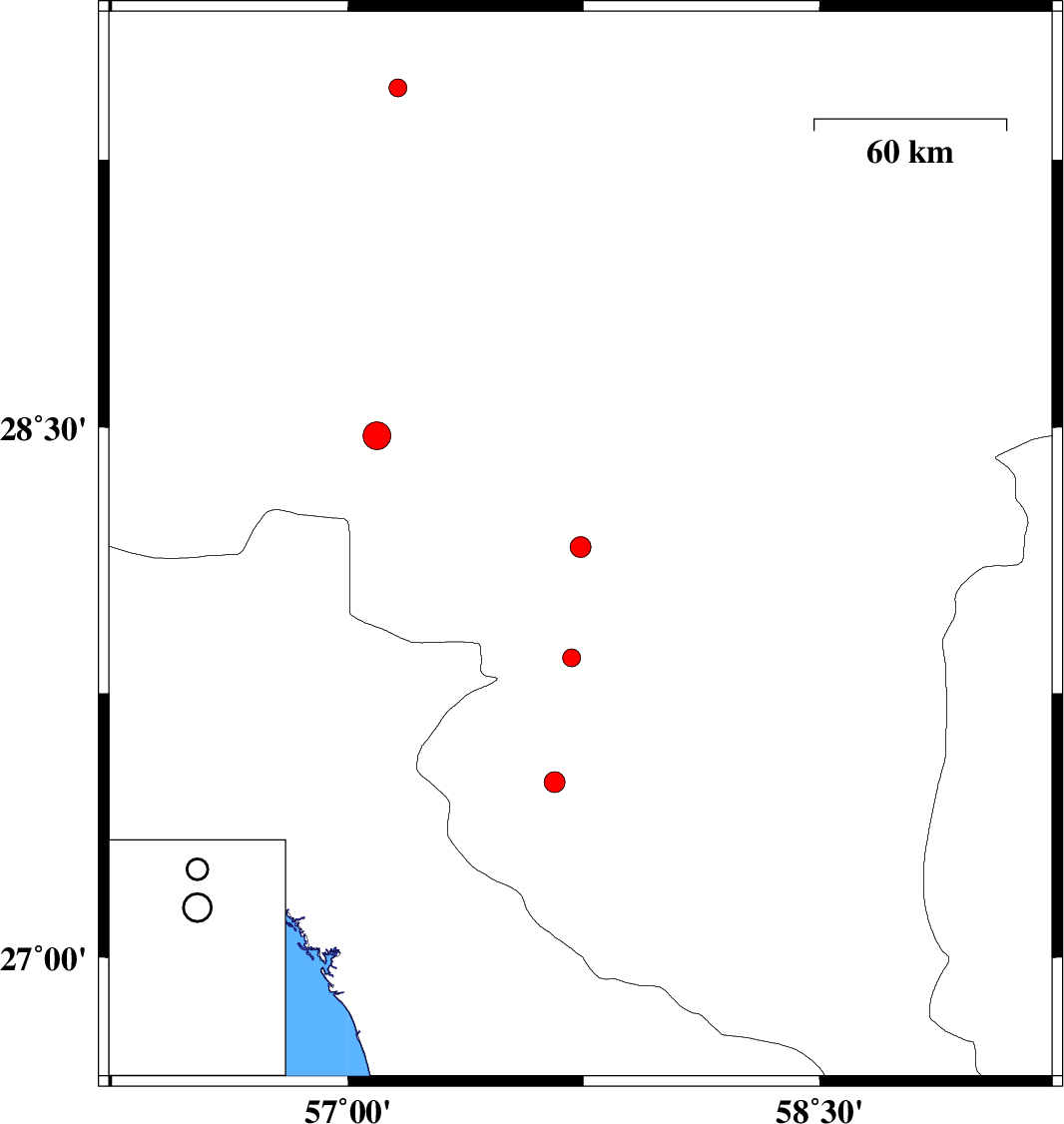 | 2016/06/20 | 03:58:18.2 | 08:28:18.2 | 27.85 | 57.712 | 15 | ML:2.6 | Kerman Province, 11 km South of Kahnuj |