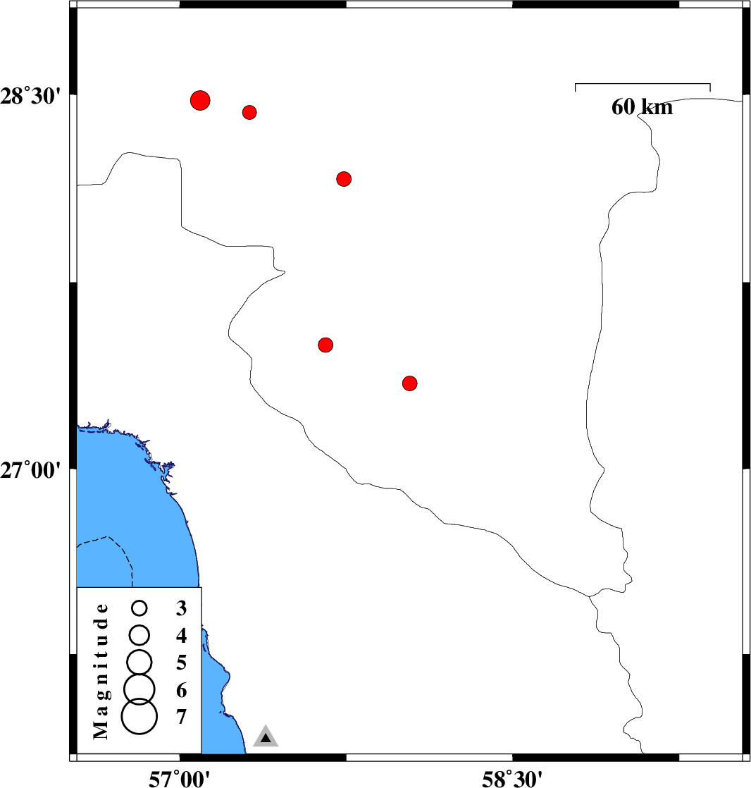 | 2016/06/26 | 05:28:25.4 | 09:58:25.4 | 27.499 | 57.657 | 14 | ML:2.9 | Kerman Province, 19 km -East of Manujan |