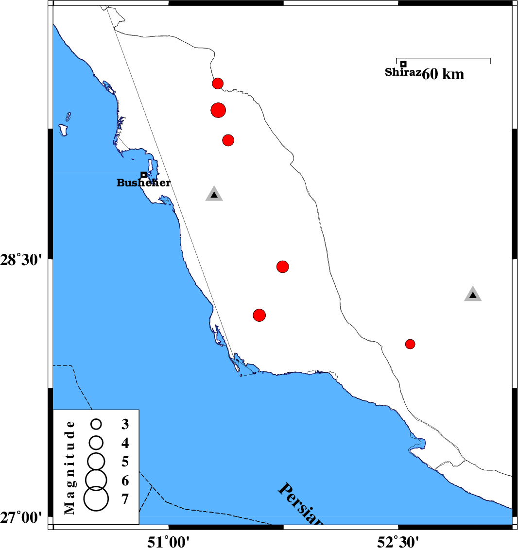 | 2016/06/06 | 04:06:55.5 | 08:36:55.5 | 29.508 | 51.321 | 6 | ML:3.3 | Fars Province, 30 km North-East of Borazjan |