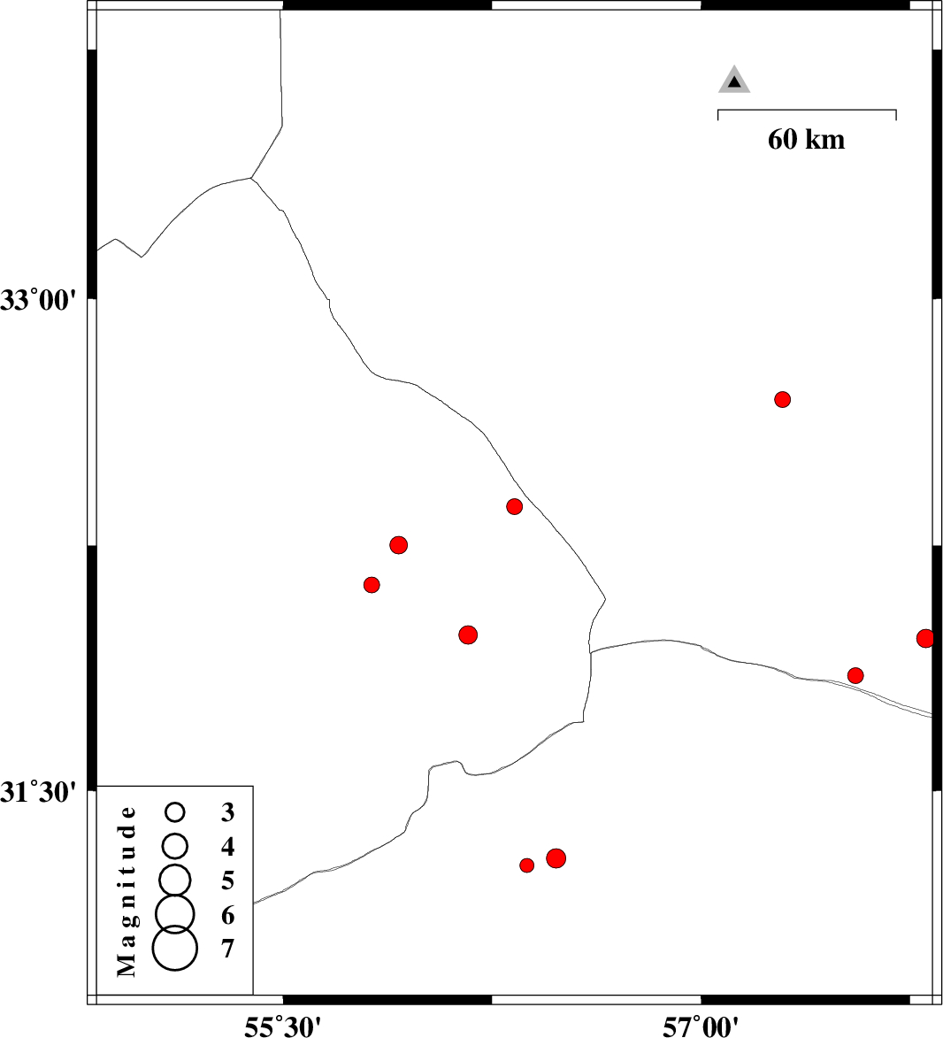 | 2016/06/28 | 20:31:19.6 | 01:01:19.6 | 31.852 | 57.554 | 18 | ML:2.5 | Yazd Province, 96 km North-East of Ravar | ||